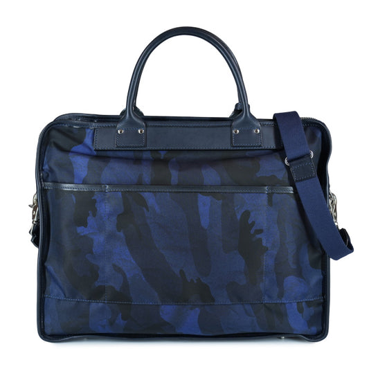 Clive di Felisi borsa da lavoro realizzata in nylon tecnico camouflage blu con finiture in pelle di vacchetta blu