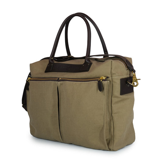 Claus Felisi borsa da lavoro a mano e tracolla in canvas di cotone colore beige e finiture in pelle di vacchetta colore marrone scuro
