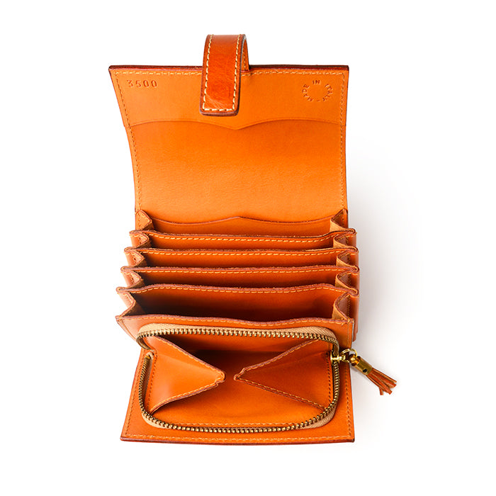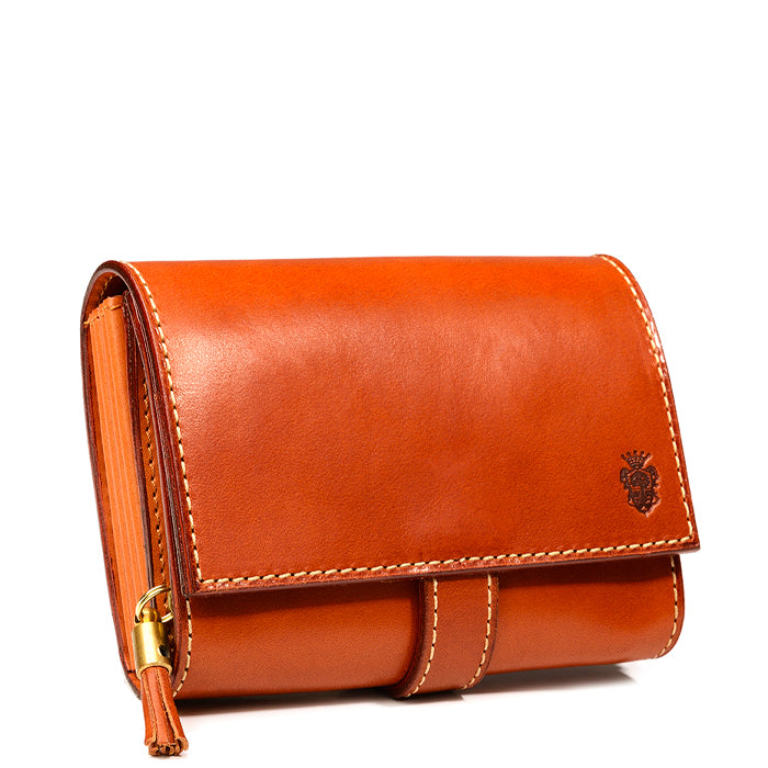 Portafoglio donna iconico Grace di Felisi con interno a multitasche, pratico e resistente. Realizzato in pelle di vacchetta di colore chiaro ed interno completamente foderato in pelle con bottone automatico e tasca con zip portamonete.