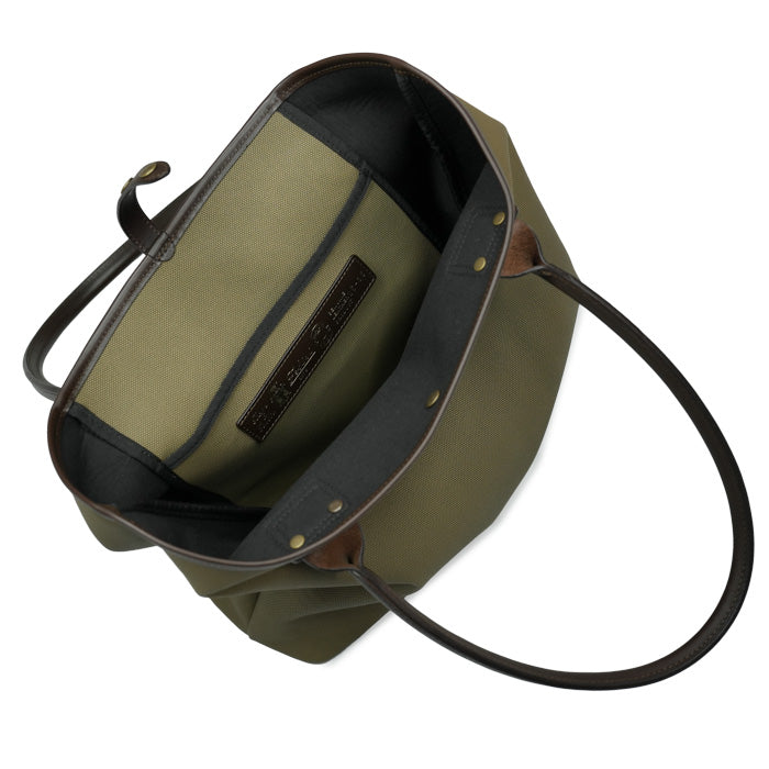 Jaxy di Felisi toto bag in tessuto gommato doppiato militare con finiture in pelle di vacchetta marrone scuro.